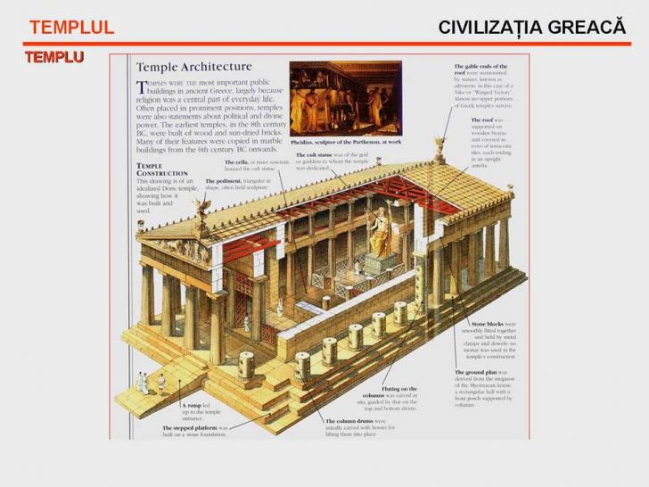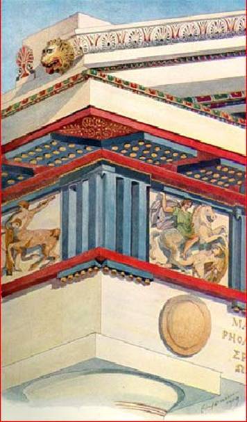 La partea superioara a cornisei fatadelor laterale ale templului se punea un jgheab de scurgere a apei