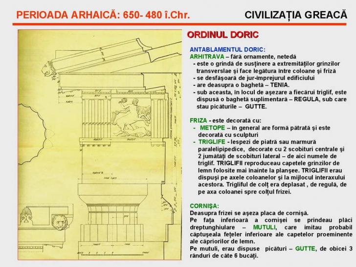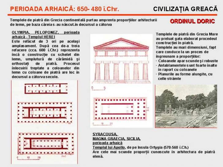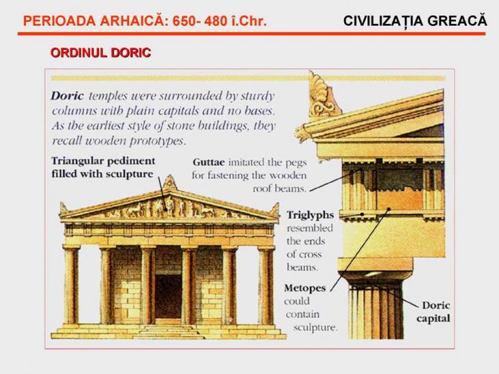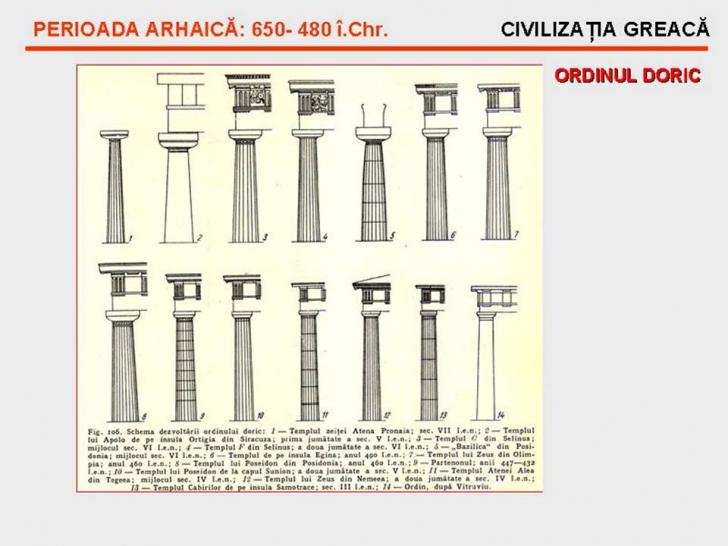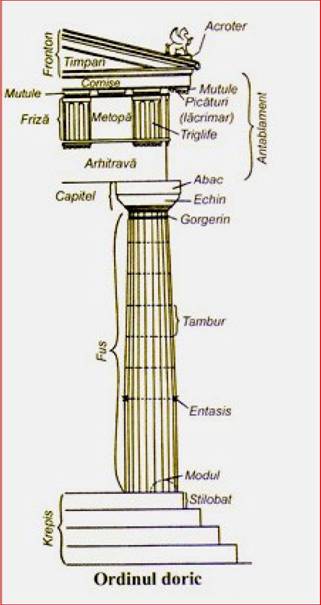 Formele ordinului doric deriva din formele vechiului ordin de lemn, care prin transpunere īn piatra īsi modifica treptat formele si proportiile, pe masura ce se acumuleaza experienta.