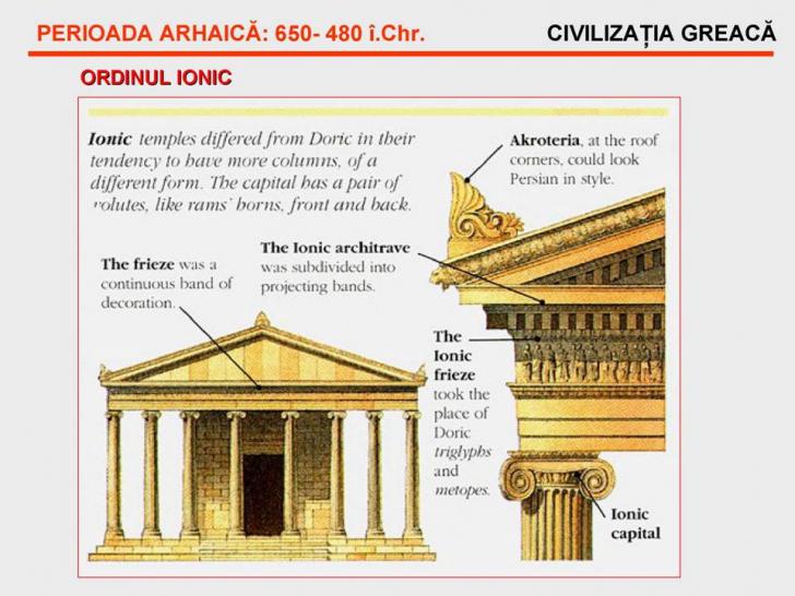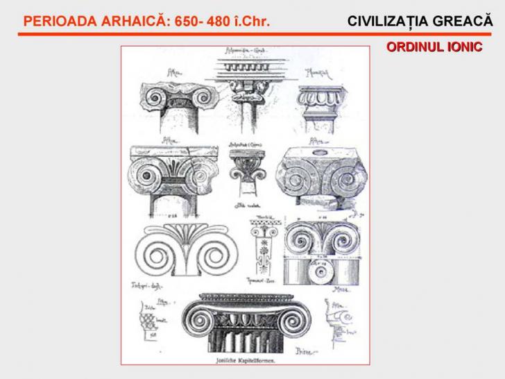 La capitelul ionic, dezvoltat īntre abaca si echina, se afla o placa cu 2 VOLUTE care formeaza toruri pe marginile capitelului ABACA, acoperita deseori cu un ornament din frunze, este formata dintr-o placa subtire cu profil de tor sau de talon. ECHINA este ornamentata cu OVE si este separata de fusul coloanei printr-un tor - ASTRAGAL, tratat īn forma unui sir de perle. VOLUTELE au forma unei spirale care se termina cu un ochi circular. Ionicul este singurul ordin care are capitelul cu fete deosebite, fapt care face dificila tratarea coloanei de colt. La capitelurile de colt, ambele laturi exterioare sunt formate din volute, voluta de colt fiind plasata pe diagonala capitelului, astfel īncāt capitelurile sa aiba