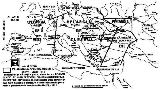 De la Atlantic si pâna la Marea de Azov a existat o impresionanta arie culturala, o manifestare culturala, de la "dansul" bizonilor, din sanctuarul-pestera de la Altamira (Spania) sau de la Font-de Gaume (Franta), "Felina de Fildes" de la Pavlov (Cehia) la "Pantera, cai si cavaler ucis", din sanctuarul-pestera de la Cuciulat (15.000-12.000 î.H. - România), ori la "Gaie-n atac", din sanctuarul pesterii Gaura Chinidiei (10.000-8.000 î.H. - România) si pâna la figura stranie, cosmica, a basoreliefului din sanctuarul-pestera de la sinca-Veche. Trebuie sa-l amintesc cu placere pe domul Ion Pachia Tatomirescu, care în caietele Daco-României vorbeste despre o unitate culturala-arhaic-europeana, pelasgica, aparuta în perioada anilor 30.000-8.175 î.H. si care a devenit o unitate stabila la orizontul anului 8.175 î.H., fragmentându-se în trei unitati. Aceste unitati s-au dezvoltat în acel "apogeu al neoliticului" diferentiindu-se în: Pelasgia de vest - de la Atlantic si pâna în Alpi, Pelasgia de centru - de la Alpii Rasariteni si Sardinia pâna la Nipru si Marea Getica (Marea Neagra), de la Carpatii Nordici si Marea Baltica dintre Oder si Neamuna, pâna în Sicilia, Creta (Marea Tracica aparând mult mai târziu când puntea de pamânt ce lega Asia Mica de Peninsula Balcanica se va prabusi în Marea Mediterana, în urma cu 4.000 de ani, lasând o puzderie de noi insule si o noua mare: Marea Tracica - nume schimbat de greci mai târziu în Marea Egee.
