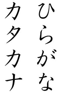 <-Comparatie īntre caracterele hiragana (coloana din dreapta: "hi-ra-ga-na") si caracterele katakana (coloana din stīnga: "ka-ta-ka-na").