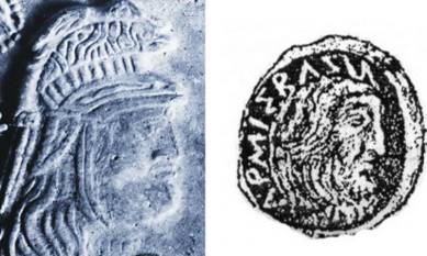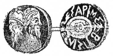 6. Moneda de argint. Avers: un cap cu doua fețe, tip Ianus. Revers: legenda SAPMIS BASIΛ și o broasca țestoasa, pe care se vede un scut, iar pe scut o lance. Pe ambele laturi S (Arneth, Sitz.-Ber. ibid.).
