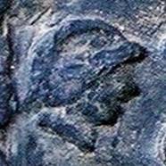 Este cea mai elaborata reprezentare, conține multe detalii de fizionomie și accesorii. Figura este reprezentata in profil spre dreapta, ceea ce certifica, conform canoanelor antice, ca nu este vorba de o reprezentare a unei divinitați, care sunt de regula infațișate frontal. Barbatul reprezentat are barbia și nasul puternice, este imberb și pare destul de tanar. Are plete care se așeaza in șuvițe pe umeri, iar pe cap poarta un coif impodobit cu o pasare ale carei aripi și cap se dinsting clar. Între coif și pasarea care il impodobește se mai distinge o imagine, a unui animal ciudat, posibil un pește. Animalul are botul alungit, iar pe corp prezinta striații in diverse direcții. Imaginea e destul de ștearsa, din pacate. La baza gatului sunt reprezentate doua figuri miniaturale, una din fața, posibil umana, care pare sa poarte o coafura feminina, cu carari pe mijloc si bucle mari pe umeri. Figura se regaseste in mai multe placi (ex. R011). Cea de-a doua figura este a unui barbat cu plete si barba bogate, reprezentat in profil dreapta.