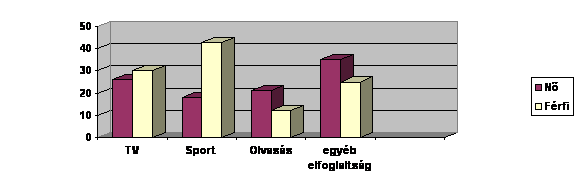 Nagy furcsaságot mutat egy másik felmérés is (ahol a 18-25 év közötti korosztályt kérdeztem) miszerint a nők néznek inkább Televíziót, mint sem a férfiak. A férfiak inkább töltik elmondásuk szerint szabadidejüket sporttal, mint hogy otthon üljenek.