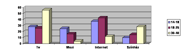 A diagramm jól mutatja, hogy az idősebb korosztályt a mozi világa nem ejti rabul, míg a fiatalabb korosztályt a színház nem mozgatja meg. Többek között az is kiderül, hogy a megkérdezett korosztályok közül a 30-40 év közöttiek töltik el szabadidejüket a televízió előtt legnagyobb százalékban, pontosan 53 %-uk, míg a tizenéveseknek csupán ennek a fele ül le délután, illetve este a televízió elé.