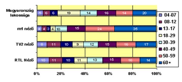 A diagrammból jól látszik, hogy az RTL Klub az, aki a legfiatalabb nézői bázissal rendelkezik, és tudatosan, 1997-től a kereskedelmi szempontból legfontosabb 18-39/18-49 éves generációt célozta/célozza meg.