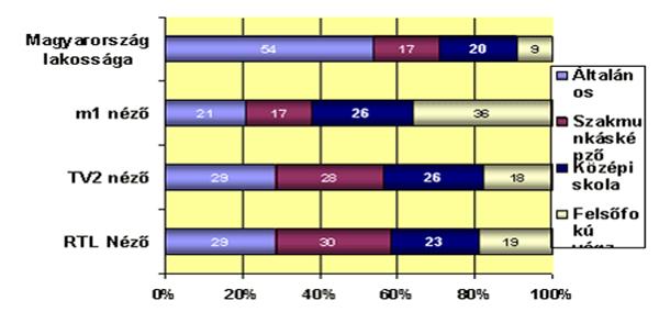 Érdekes tény, hogy a felsőfokú végzettségűek lényegesen kevesebb időt töltenek egy nap a képernyők előtt, mint az alacsonyabb végzettségűek, mégis minden csatorna esetében felül vannak reprezentálva az országos arányokhoz képest.