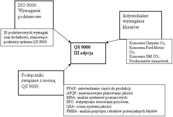 System QS- 9000 złożony jest z trzech części podstawowych, normują one wymagania dotyczące ksiąg systemów jakości u dostawców, do wymagań każdego z koncernów, oraz metody oceny stopnia wypełnienia tych wymogów. Na rysunku 1 wyszczególnione zostały wymagania, jakie spełniać musi przedsiębiorstwo motoryzacyjne w zakresie jakości. Należy dodać, że wyroby specjalistyczne opracowane są indywidualnie przez każdy koncern. System Zarządzania Jakością w firmie pomaga wybrać dostawcom określone, preferowane rozwiązania.