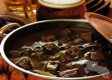 postup: Na tuku připravíme tmavsí základ z cibule, kořenové zeleniny, rajského protlaku a cukru, zastříkneme octem, přidáme koření, zalijeme pivem a povaříme. Maso nakrájené na mensí kousky se orestuje, přelije procezeným základem a dusíme doměkka. Maso vyjmeme a základ podle potřeby dohustíme jískou, přidáme povidla, brusinkový kompot, citrónovou sťávu, krátce povaříme a vzniklou omáčkou maso opět zalijeme. Jako příloha se hodí zapékané brambory, bramborové krokety, noky nebo jemný karlovarský knedlík.