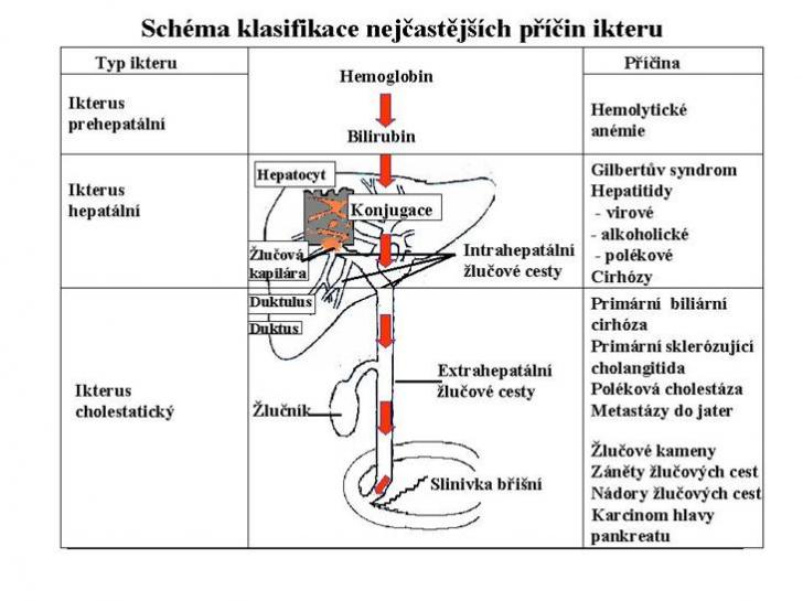 Ikterus můze vzniknout různými cestami. Zvýsenou nabídkou bilirubinu hepatocytům, jejich poruchou bilirubin přijat a konjugovat, poruchou exkrece na biliární membráně nebo obstrukcí zlučových cest. Podle mechanismu vzniku dělíme ikterus do tří skupin. Ikterus prehepatální (hemolytický), ikterus hepatální (parenchymatózní, hepatocelulární) a ikterus cholestatický (obstrukční, mechanický). Základní příčiny jsou uvedeny na schématu. Zvlástní skupinu hepatálního ikteru představují syndromy familiární nehemolytické hyperbilirubinémie. Pro praktického lékaře má největsí význam Gilbertův syndrom, postihující 5 i více procent populace. Jde o benigní onemocnění charakterizované isolovaným zvýsením nekonjugovaného bilirubinu, který stoupá po hladovění, fyzické námaze, stresových situacích nebo po bězných infekcích. Ale i mimo ikterickou fázi mají nemocní obtíze, převázně dyspeptické, které nekorelují s negativním ostatním nálezem, včetně normální jaterní biopsie. K ověření diagnózy slouzí jednoduché testy, mozné provést ambulantně. Test hladověním: dvoudenní redukce přijmu energie na 400 kcal vede k zvýsení nekonjugovaného bilirubinu na dvojnásobek výchozí hodnoty. Test s fenobarbitalem: podání fenobarbitalu v dávce 200mg (50-50-100) vede k signifikantnímu snízení nekonjugovaného bilirubinu. Ostatní syndromy jsou vzácné.