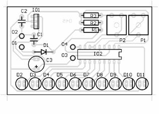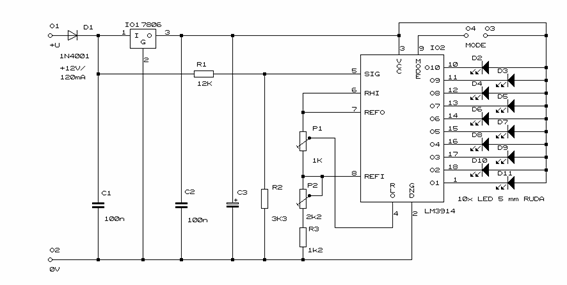 Indikátor je navrzen pro kontrolu napětí dvanáctivoltové automobilové baterie a je zároveň jejím napětím napájen. Na vstupu je zapojena dioda D1, která chrání indikátor před přepolováním napájecího napětí. Stabilizátor IO1 slouzí jednak jako ochrana integrovaného obvodu IO2 proti napěťovým spičkám, které mohou vznikat na baterii při provozu, a také pro snízení napájecího napětí pro svítivé diody na doporučené maximum, při němz se jestě nemusí pouzít omezovací odpory. C1 a C2 zabraňují rozkmitání stabilizátoru IO1 a kondenzátor C3 je filtrační. Vstupní napětí pro IO2 se snizuje přiblizně na jednu pětinu odporovým děličem, slozeným z rezistorů R1 a R2. Trimr P1 slouzí k nastavení napětí, při němz se rozsvítí první dioda (D11) a trimr P2 k nastavení napětí, při kterém se rozsvítí poslední indikační dioda (D2). Rezistor R3 posouvá rozsah napětí, nastavitelných trimrem P2 nahoru. Přivedením napětí na vstup MODE integrovaného obvodu IO2 se mění bodový provoz na prouzkový.