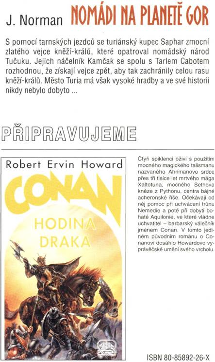 „Ale domnívám se,“ řekl Kamčak, „že Saphrar z Turie je nakonec přeplatí a vozy budou zapáleny a bosci pobiti.“ Zaskřípěl zuby. „Dosud tak neučinil, protože jsme mu zatím nijak neuškodili. Ani o nás neví.“
