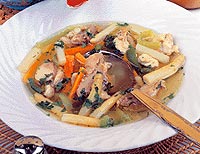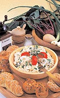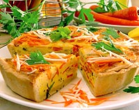 Náplň: Očistěnou a nakrájenou zeleninu dáme vařit do zeleninového vývaru. Potom zeleninu scedíme a necháme vychladnout. Celá vejce rozsleháme, smícháme je se smetanou, mlékem, moukou a nastrouhaným tvrdým sýrem. Přidáme nakrájenou pazitku a petrzelovou nať. Osolíme, opepříme a promícháme.