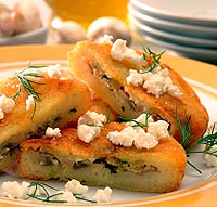 Brambory uvaříme ve slupce a necháme vychladnout. Potom je jemně nastrouháme, přidáme sůl, zloutek a hrubou mouku. Vypracujeme těsto, které rozdělíme na stejné části. Kazdou část roztáhneme do větsí placky, naplníme vychladlou náplní, přelozíme napůl a zformujeme řízky. Obalíme ve strouhance a smazíme na oleji z obou stran. Smazené řízky posypeme kousky sýra feta.