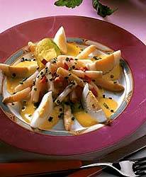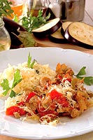 Maso odblaníme, umyjeme, nakrájíme na kostky a dáme vařit do osolené vody. K poloměkkému masu přidáme kolečka mrkve, očistěný chřest zbavený tvrdých částí, přikryjeme a vaříme doměkka. Z oleje a mouky připravíme jísku, zalijeme mlékem, osolíme a za stálého míchání několik minut povaříme. Přilijeme k masu, přidáme hrásek, okořeníme a jestě několik minut vaříme. Nakonec dochutíme citrónovou sťávou. Podáváme s rýzí.