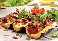 Cuketu podélně rozkrojíme a vnitřek z ní vydlabeme. Kazdou část cukety pak rozkrojíme na tři stejné kousky. Mleté maso ochutíme solí, pepřem, paprikou, majoránkou a chilli. Promícháme a necháme 10 minut stát. Potom maso opečeme za stálého obracení do měkka. Papriky nakrájíme na kousky, osolíme a prudce orestujeme na oleji. Přidáme opečené maso, petrzelku a promícháme. Vydlabané časti cuket potřeme taveným sýrem a na něj dáme připravenou náplň. Posypeme tykvovými semínky a pokapeme opepřenou kysanou smetanou.