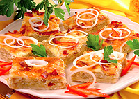 Na pomoučněném vále rozválíme těsto, navrstvíme vychladlou náplň a svineme. Závin polozíme na suchý plech, potřeme vejcem rozslehaným se solí a posypeme sezamem. Vlozíme do trouby vyhřáté na 180 oC a upečeme do růzova. Náplň: Jemně nakrájenou cibuli osmazíme na oleji, přidáme cuketu a papriky nakrájené na malé kostky, kukuřici, hrásek, sůl, bílý pepř, provensálské koření a několik minut dusíme. Nakonec zeleninu zahustíme rozslehanými vejci a přidáme nasekanou nať a pazitku. |