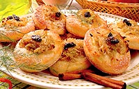 Do vlazného mléka přidáme drozdí, spetku soli, trochu cukru a na teplém místě necháme vzejít kvásek. Do misky dáme prosátou polohrubou a hrubou mouku, změklé máslo, moučkový cukr, zloutky a kvásek. Vypracujeme hladké těsto, které přikryjeme a na teplém místě necháme kynout. Pak ho rozválíme na pomoučněném válu a kulatou formičkou vykrajujeme koláčky. Uprostřed kazdého koláčku vyhloubíme jamku, okraje potřeme vejcem a do středu vlozíme náplň. Ozdobíme rozinkami a přendáme na plech pokrytý papírem na pečení. Pečeme ve vyhřáté troubě, po upečení posypeme moučkovým cukrem.