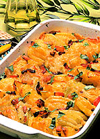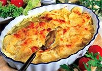 Brambory oloupeme, umyjeme a nakrájíme na kolečka. Polovinu vlozíme do vymazané zapékací nádoby, osolíme a opepříme. Na oleji osmazíme cibulku nakrájenou na kolečka, jemně osolíme, promícháme a rozlozíme na brambory. Zbylé brambory poskládáme na cibuli, osolíme, opepříme a zalijeme rozmíchanou kysanou smetanou. Vlozíme do vyhřáté trouby a zapékáme asi 15 minut. Potom brambory posypeme jemně nastrouhaným sýrem, pokapeme rozpustěným máslem a do růzova zapečeme. Podáváme jako lehkou večeři se zeleninovými saláty nebo jako přílohu k masu. Jídlo můzeme připravit i z vařených brambor, čímz se doba zapékání zkrátí.