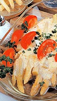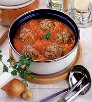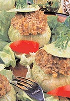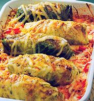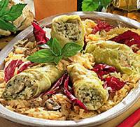 Zelné závitky1 mensí hlávka bílého zelí, Zelí očistíme, vlozíme na pět minut do vroucí vody, vyjmeme a zchladíme ve studené vodě. Kosťál vyřízneme a oddělíme osm vrchních listů. Zbylé zelí nakrájíme na nudličky. Hlívu umyjeme, tvrdé části odstraníme a nakrájíme na nudličky. Slaninu pokrájíme na kostičky, rozskvaříme, přidáme jednu drobně nasekanou cibuli, hlívu, osolíme, opepříme a dusíme patnáct minut. Necháme vychladnout. Přidáme rýzi, rozslehané vejce, sůl, pepř, prolisovaný česnek a promícháme. Směsí naplníme zelné listy, svineme a převázeme nití. Zbylou cibuli nakrájíme, osmazíme na oleji, přidáme protlak, nakrájené zelí, osolíme, opepříme a zalijeme horkým vývarem. Vlozíme zelné závitky a za občasného promíchání dusíme asi třicet minut. Nakonec dochutíme cukrem. |