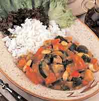 Umytou cuketu nakrájíme na kolečka, osolíme a necháme stát. Na oleji zpěníme očistěnou a nakrájenou cibuli, přidáme zampiony, mrkev a celer a krátce společně osmazíme. Podlijeme vodou, osolíme a dusíme takřka do měkka. Přidáme cuketu, nakrájená rajčata, mandle, podlijeme vínem a udusíme do měkka. Ochutíme cukrem a podáváme s dusenou rýzí a zeleninovým salátem.
