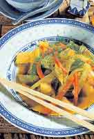 přidáme mrkev a celer a za stálého míchání krátce osmazíme. Posypeme kari