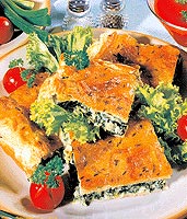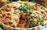 Spagetový dortSpagety nalámeme, podle návodu uvaříme, scedíme a necháme okapat. Jemně nakrájenou cibuli osmazíme na oleji, přidáme sunku nakrájenou na nudličky, mrazenou zeleninu, nadrobno nakrájenou papriku, zampiony a krátce podusíme. Ochutíme prolisovaným česnekem, solí a pepřem, spagety smícháme se zeleninovou směsí, nastrouhaným parmezánem a nasekanou natí. Vlozíme do kulaté formy a ve vyhřáté troubě zapékáme deset minut. Potom zalijeme vejci rozslehanými se smetanou a solí, posypeme strouhaným sýrem, vlozíme zpět do trouby a pečeme do růzova při teplotě 180 oC asi 20 minut.