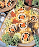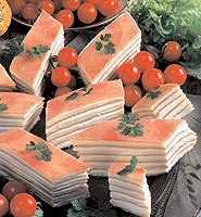 Krémový sýr smícháme s pochoutkovou smetanou, mletým bílým pepřem a se solí. Přidáme zelatinu připravenou podle návodu a dobře promícháme. Na alobal rozlozíme plátky sunky a potřeme je připravenou sýrovou směsí, kterou přikryjeme plátky sýra a opět potřeme. Postup zopakujeme. Naplněné pláty sunky a sýra necháme v lednici čtyři hodiny tuhnout, pak je nakrájíme na kousky.