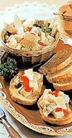 Očistěný celer nakrájíme na kostky a v mírně osolené vodě uvaříme do měkka. Scedíme, přendáme do mísy, pokapeme citronovou sťávou a promícháme. Přidáme oloupané na kostky nakrájené brambory, očistěnou nadrobno nakrájenou cibuli, nakrájené zampiony, osolíme, opepříme a promícháme. Smetanu smícháme s ochucenou majonézou a jemně vmícháme do salátu spolu s nakrájeným chřestem. Podáváme na topinkách ozdobené vařenými vejci, kečupem a petrzelovou natí.
