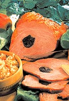 Sunku omyjeme, osusíme. Doprostřed uděláme ostrým nozem otvor po celé délce. Svestky umyjeme a na půl hodiny namočíme do koňaku. Potom jednu po druhé vtlačíme do otvoru v mase. Pak maso ze vsech stran potřeme silnou vrstvou kari, pokapeme vínem, vlozíme do fólie na pečení a pevně uzavřeme. Fólii nahoře několikrát propíchneme jehlicí. Připravené maso vlozíme do pekáče a ve vyhřáté troubě pečeme asi hodinu. Maso necháme vychladnout ve fólii, potom ho nakrájíme na plátky a podáváme s čatní.