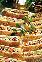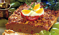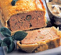 Maso a salám nakrájíme na kostky a dvakrát umeleme na masovém mlýnku. Přidáme dvě rozslehaná vejce, hořčici, zelený a cayenský pepř, majoránku, utřený česnek, sůl, koriandr, citronovou kůru, rum, nasekanou nať a důkladně promícháme. Chlebíčkovou formu vylozíme dvěma třetinami rozváleného těsta tak, aby okraje přečnívaly. Polovinu masové náplně rozetřeme na těsto, doprostřed vtlačíme celé olivy obalené v plátcích sunky a přikryjeme zbylou náplní. Okraje těsta přelozíme přes náplň, přikryjeme zbývající třetinou rozváleného těsta a přitiskneme. Potřeme rozslehaným vejcem a ozdobíme různými tvary vykrojenými ze zbylého těsta. V troubě vyhřáté na 180 oC pečeme asi 50 minut. Chlebíček necháme vychladnout do druhého dne, nakrájíme a podáváme s libovolnou omáčkou.
