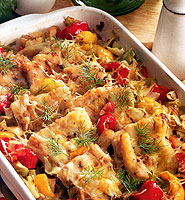 Filé opláchneme a na několik hodin namočíme do mléka. Potom ho vyjmeme, opláchneme studenou vodou, osusíme, osolíme, opepříme a na rozehřátém oleji opečeme z obou stran. Očistěné zelí a papriky zbavené semen a nakrájíme na mensí kousky. Slaninu nakrájíme na kostičky, rozskvaříme, přidáme nadrobno nasekanou cibuli a osmazíme. Přidáme zeleninu, kmín, osolíme, opepříme, zalijeme polovinou vývaru a dusíme 30 minut. Filé a zeleninu vlozíme do zapékací misky, podlijeme zbylým vývarem a posypeme strouhaným sýrem. Vlozíme do vyhřáté trouby a zapékáme asi 15 minut.