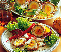 Maso smícháme se solí, pepřem, namočenou a vymačkanou houskou, nasekanou petrzelkou, pazitkou a tymiánem. Rozdělíme na čtyři části, do kazdé vtlačíme oloupané vejce a navlhčenýma rukama upravíme. Na rozehřátém oleji smazíme ze vsech stran. Vejce podáváme buď teplá s bramborovou kasí a salátem, nebo na studeno politá omáčkou s čerstvou zeleninou. Omáčka: Smetanu, kečup, hořčici a sůl usleháme a vmícháme nasekanou petrzelovou nať a pazitku.