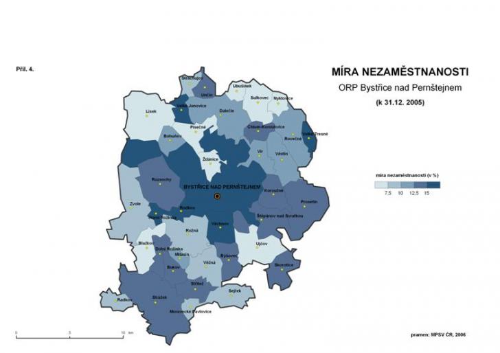Tab.11: Počet dosažitelných uchazečů o zaměstnání a míra registrované nezaměstnanosti v jednotlivých obcích obvodu ORP Bystřice nad Pernštejnem
