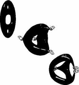 V následujících měsících jsem o jejich domněnce hodně přemýslel, a abych řekl pravdu, napůl jsem nabyl přesvědčení, ze není pravdivá. Zdánlivě nesouvisející projekt, na kterém jsem pracoval s Ronenem Plesserem, tehdy postgraduálním studentem na Harvardu (nyní je členem sboru Weizmannova institutu a Dukeovy univerzity), vsak překvapivě můj názor zcela změnil. Spolu s Plesserem jsme se zájmem rozpracovávali metody, jak ze známé Calabiho-Yauovy variety zkonstruovat matematickými manipulacemi dosud neznámou Calabiho-Yauovu varietu. Lákala nás zvlástě metoda orbifoldu, se kterou začal Laňce Dixon, Jeffrey Harvey z Chicagské univerzity, Cumrun Vafa a Edward Witten v polovině osmdesátých let. Přiblizně jde o proceduru slepení různých bodů původní variety podle pravidel, která zaručují, ze výsledná varieta je opět Calabiho-Yauova. Schematicky ji znázorňuje obrázek 10.4. Za manipulacemi z obrázku stojí impozantní matematika, a proto je fyzici zkoumali jen na nejjednodussích tvarech - vícerozměrných verzích věnečkovitého tvaru z obrázku 9.1. S Plesserem jsme si ale uvě-