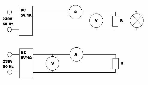 Sestavíme obvod podle schématu a odečítáme hodnoty na měřících přístrojích, vse opakujeme se zárovkou.