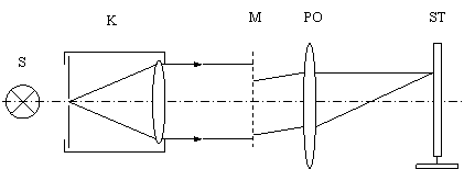 K měření pouzijeme sestavu postavenou na optické lavici, kde S je světelný zdroj, K kolimátor, M mřízka, PO pomocný objektiv a ST matnice s příčným posuvem, nebo měřítkem.