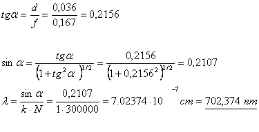 Ohybový obrazec mřízky se skládá z nultého maxima (k = 0), ve kterém nedochází pro slozené světlo k disperzi a na obou stranách se pak objeví maxima odpovídající k = 1,2,., různě polozená pro různé vlnové délky. Známe-li nyní úhel a, můzeme ze známé konstanty a, resp. N vypočítáme vlnovou délku l pouzitého světla.