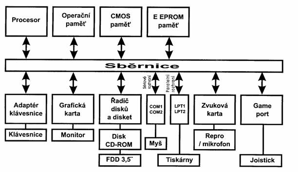Mezi jednotlivými částmi počítače (mezi procesorem a paměťmi, mezi procesorem a přídavnými zařízeními) musí být zařízení, které plní funkci komunikačního prostředku. O to se stará sběrnice, která zajisťuje přenos :