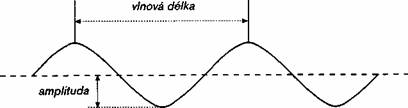 Obrázek 4.2 Vlnová délka je vzdálenost mezi následujícími hřebeny vlny. Amplitudou míníme maximální výsku nebo hloubku vlny.