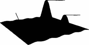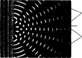 Jelikoz fotografická deska zachycuje, jak intenzivně přicházející světlo "chvěje" s daným bodem, stejné argumenty platí i pro elektromagnetické vlny tvořící světelný paprsek a plyne z nich, ze otevřeme-li obě stěrbiny, fotografie se bude podobat obrázku 4.8. Nejjasnějsí oblasti na obrázku 4.8 jsou tam, kde se setkaly hřebeny obou vln (nebo údolí obou vln). Temné oblasti vzniknou v místech, kde se hřebeny jedné vlny setkaly s údolími druhé vlny a zrusily se navzájem. Posloupnost světlých a tmavých prouzků je známa jako interferenční vzorek f nebo také interferenční obrazec). Taková fotografie se značně lisí od obrázku 4.6; máme tedy konkrétní experiment, jímz lze rozsoudit spor mezi částicovým a vlnovým obrazem světla. Experiment tohoto druhu uskutečnil Young a jeho výsledky odpovídaly obrázku 4.8; potvrdily tak vlnovou teorii světla. Newtonův částicový pohled byl porazen (ačkoli nějakou dobu trvalo, nez se s tím fyzici smířili). Vítězný vlnový obraz světla postavil pak na matematicky pevnou půdu Maxwell.
