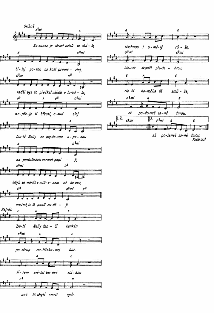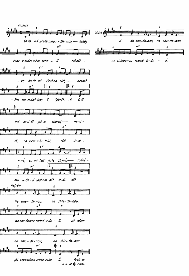 E Cesta má přede mnou v dáli mizí H7 kazdý krok v srdci mém zabolí E E7 A zakrátko bude mi vsechno cizí E H7 E nespatřím své rodné údolí. E A E H7 E Na shledanou, na shledanou, na shledanou rodné údolí A já volám na shledanou, na shledanou E H7 E při vzpomínce srdce zabolí. Oči mé nevidí jak se stmívá Proč se den za kazdou nocí vrací |