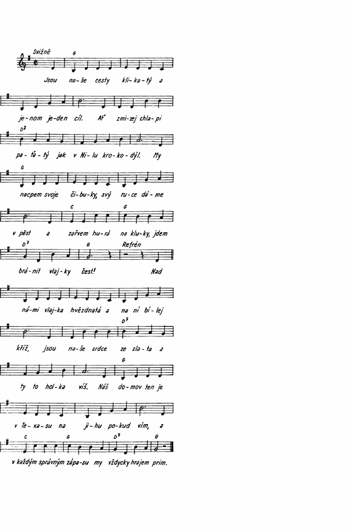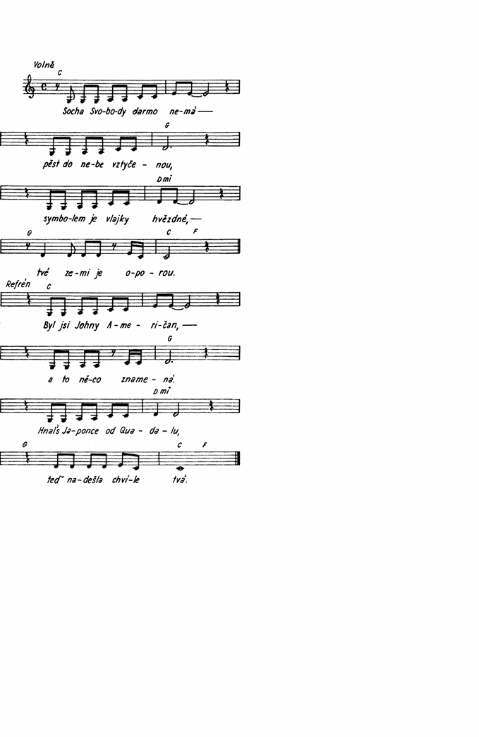 čibuky svý ruce dáme v pěst a zařvem hurá na kluky jdem bránit vlajky čest. G Nad námi vlajka hvězdnatá a na ní bílej kříz D7 G nás domov ten je v Texasu na jihu pokud vím C G D7 G a v kazdým správným zápasu my vzdycky hrajem prim. I toho zrzka v siráku toho holka znás My vlastně nejsme vojáci a kdyz to