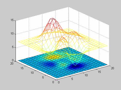 Příkaz hidden dovoluje nebo zakazuje odstranit skryté čáry. Přidáváme-li do jednoho grafu dalsí, můze být vhodné zakázat odstranění skrytých čar. Následující příkazy zobrazují drátový model plochy peaks nad stejnou plochou generovanou funkcí pcolor. Protoze příkaz hidden off neumozní odstranit skryté čáry, je drátový model průhledný a vidíme i celou plochu generovanou funkcí pcolor.