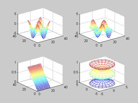 subplot(m,n,p) rozdělí grafické okno na m*n oblasti (os) a vybere pro aktuální graf p-tou z nich. Oblasti jsou číslovány po řádcích shora. Následující příkazy znázorní data do čtyř různých podoblastí grafického okna.