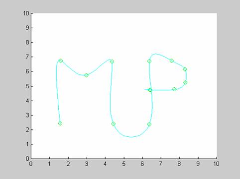 Následující příklad popisuje, jak pouzít funkci ginput spolu s funkcí spline pro vytvoření 2-D křivky pomocí interpolace. (Tento příklad nevyuzívá Spline Toolbox, který obsahuje více funkcí pro práci se spliny). Nejprve je funkcí ginput vybrána posloupnost bodů [x,y] a body jsou vyneseny do grafu. Označenými body jsou prolozeny dva spliny s krokem 1/10 původní vzdálenosti a výsledek je opět vykreslen do grafu.