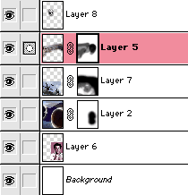 Nyní je čas na zmíněné maskování. Do vrstev přidáme masky postupem Layer - Ad Layer mask. Malováním stětcem ve vrstvách postupně odkrýváme jednotlivé části obrazů - míra krytí masky je dána, jak víme z minula, stupněm sedi v masce.