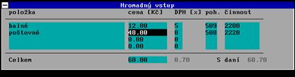 Při jeho prvním pouzití je potřeba předepsat (předkontovat) texty polozek, daň, pohyb a činnost, na které budete jednotlivé polozky účtovat. Stiskněte <F10>, program zobrazí kartu Hromadný vstup, ve které jsou přístupné pouze ceny a jinak je karta prázdná - je nutné ji předvyplnit. Uděláte to stiskem klávesy F4 - vsechny polozky se vysvítí a Vy můzete vyplňovat. Pro snazsí práci máte k dispozici seznam pohybů <F3> a seznam činností <F5>.