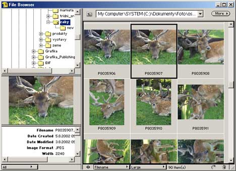 V oblasti otevírání a ukládání souborů nabízejí Elements stejný uzivatelský komfort jako Photoshop 7 - včetně paletky pro prohlízení souborů na disku (File Browser - viz nase recenze ZDE) a exportního okna pro ukládání optimalizované webové grafiky. K dispozici je i nástroj pro hromadné zpracování snímků (batch processing - např. pro hromadnou změnu velikosti snímků nebo jejich přejmenování) a nový nástroj Create Photomerge pro vytváření panoramatických fotografií. Novinkou druhé verze Elements v této oblasti je mj. podpora EXIF informací v souboru, moznost "grabování" obrázků přímo z videa, přehrávaného v dialogovém okně Elements, a moznost přímého zasílání obrázků emailem (přičemz Elements dokází uzivatele varovat v případě, ze se chystá poslat přílis velký soubor).