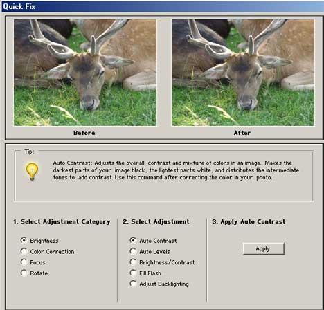 Zcela novou nabídkou Elements je menu "Enhance", sdruzující vsechny funkce pro automatickou opravu obrazu - automatické úrovně, automatický kontrast a také novinku sedmé verze Photoshopu, automatickou barevnost, která podává v řadě případů velmi dobré výsledky pro základní barevnou korekci obrazu (zejména v Elements je tato funkce velmi uzitečná, protoze nelze očekávat, ze by si bězný uzivatel pohrával s nastavením křivek). Mimo funkcí pro automatickou opravu obrazu mají i uzivatelé Elements k dispozici několik nástrojů pro ruční úpravu obrazu - nastavení světlosti, nastavení barevného nádechu (kapátkem se určí výchozí hodnota), záměna barvy (nástroj Replace Color), nebo třeba klasické ruční nastavení úrovní s určením světlého a tmavého bodu. Mimoto nabízí Elements 2 v této skupině nástrojů i oproti Photoshopu novou funkci "Quick Fix" - dialogové okno, sdruzující vsechny funkce pro automatickou opravu obrazu včetně náhledového okna s originálním a upraveným obrázkem. Uzivatel tak na jednom místě vidí změny, které se provedou po aplikaci jednotlivých funkcí. Navíc vzdy s jednoduchým vysvětlením, co která funkce v obrazu provádí.